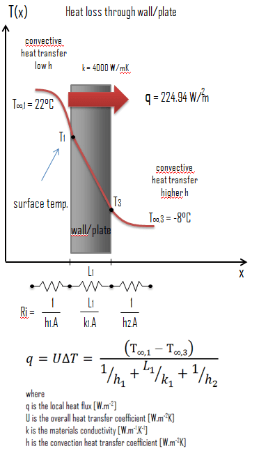 Suponiendo una transferencia de calor unidimensional a través de la pared plana y sin tener en cuenta la radiación, el coeficiente de transferencia de calor general se puede calcular como: