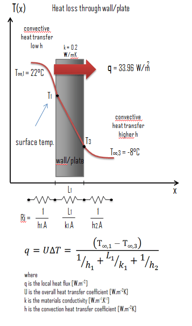 El flujo de calor se puede calcular entonces simplemente como: q = 1,13 [W / m 2 K] x 30 [K] = 33,96 W / m 2