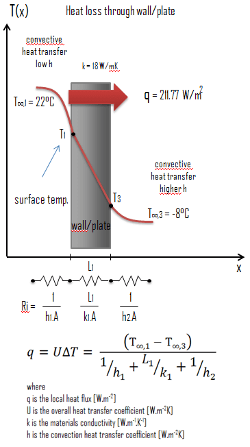 The overall heat transfer coefficient is then: U = 1 / (1/10 + 0.15/18 + 1/30) = 7.06 W/m2K